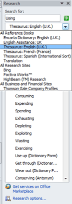With either the Research or Thesaurus button from the Review tab, the Research Pane can be opened. This looks up the selected word or phrase in the chosen reference book.