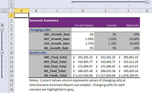 NOTE: If you name the changing and results cells, the names will be used in the summary making it much more user friendly. More details on named cells and ranges can be found in the Advanced Functions reference guide.