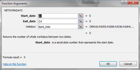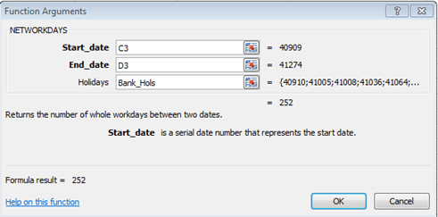 25. The formula in the formula bar will now read =NETWORKDAYS(C3,D3,Bank_Hols). Click OK