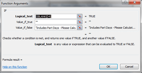 20. In cell F4 create a function which will warn about part days using the IF function, which will be =IF(ISBLANK(D4),””,”Includes Part Days – Please Calculate Total Manually”) or as shown in the box below