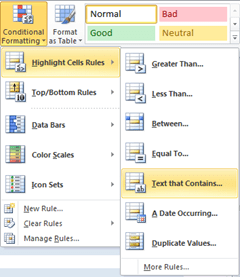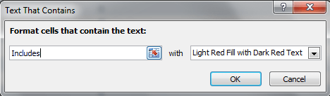 2. Enter the text Includes in the condition dialog. The default is Light Red Fill with Dark Red Text, which is the option used