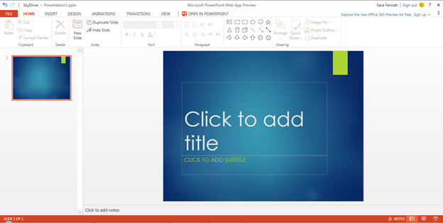 Here again the same style of interface prevails. However consistent appearance is something we have come to expect as standard from Office these days. When starting a new presentation in PowerPoint web app you first choose the theme. As a trainer this is a first step I recommend when working with PowerPoint so, in my book, that’s a good thing.