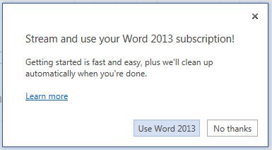On opening this file in Word on my work PC, I was offered the option of streaming my Office 2013 Home Premium subscription, also linked to my SkyDrive. Unfortunately (due to firewall restrictions) I was unable to do this. Something else to try out.