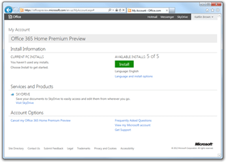 “When you purchase Office, you’re no longer buying software dedicated to a particular piece of hardware. We’ve made a bunch of investments in this version that really change the way that you get Office. For example, when you purchase the product you will land in the Management Place of Office.com. This is the place for you to go to install Office on your PC or Mac, update your account information, learn about additional entitlements you may receive with your subscription (e.g. extra SkyDrive storage) and manage your account. You’ll see here that Kaitlin is a subscriber to Office, and with that, she can install Office up to 5 times on a PC or Mac – it’s her call.”