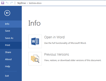 Another theme carried over from Window 8 branding is the look of the File tab. In Office 2010, the Backstage view was introduced. Combining Print Preview and the Print settings into one screen, meant that the backstage view took up the whole window – here in the web apps this looks as if it has reverted to the large menu we saw in Office 2007, instead.