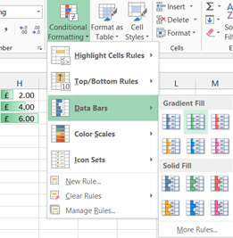 Data Bars, Colour Scales and Icon sets, calculate the format based on a comparison of the highlighted data.
