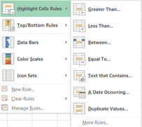 Some items in the drop down menu you may be familiar with already like Highlighting Cell Rules, Top/Bottom Rules, as these are the types of conditional formatting used in Excel 2003.