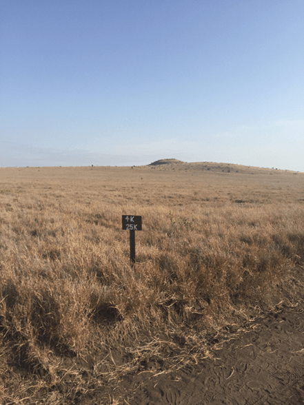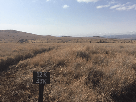 Approaching the 4km marker I spotted a rhino off in the distance. In fact the rhino is in my 4km market photo but it’s just a grey blob towards the bottom of the hill you can see.