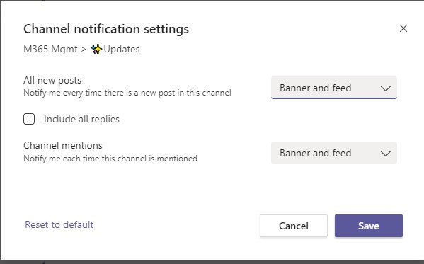Finally – In the tenant/org you are not normally working in, go to the important channel(s) and click …. next to channel name then choose channel notifications. Set it as appropriate for you.