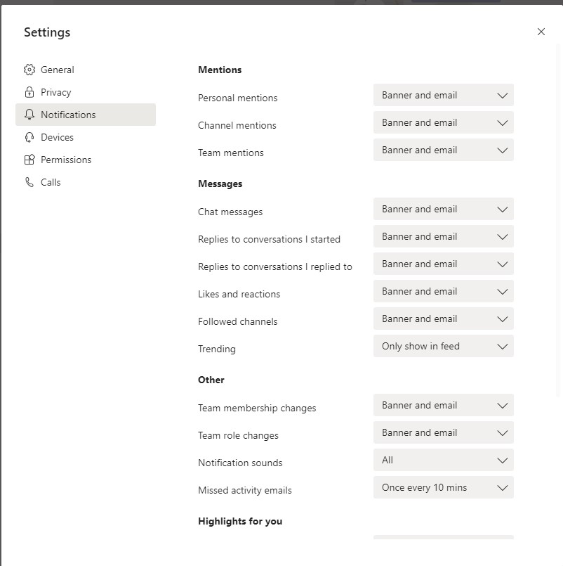 First – in you main tenant, check your general notification settings. If you have a very busy Teams environment make sure you are not going to be inundated with notifications with the settings you choose. My main tenant is quite light in Teams usage but any posts where I am tagged typically need my attention quickly, hence the once every 10 minutes setting on missed activity emails.