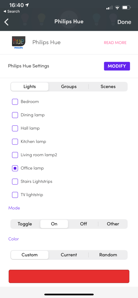 - Tap the + beside the action and pick Philips Hue
