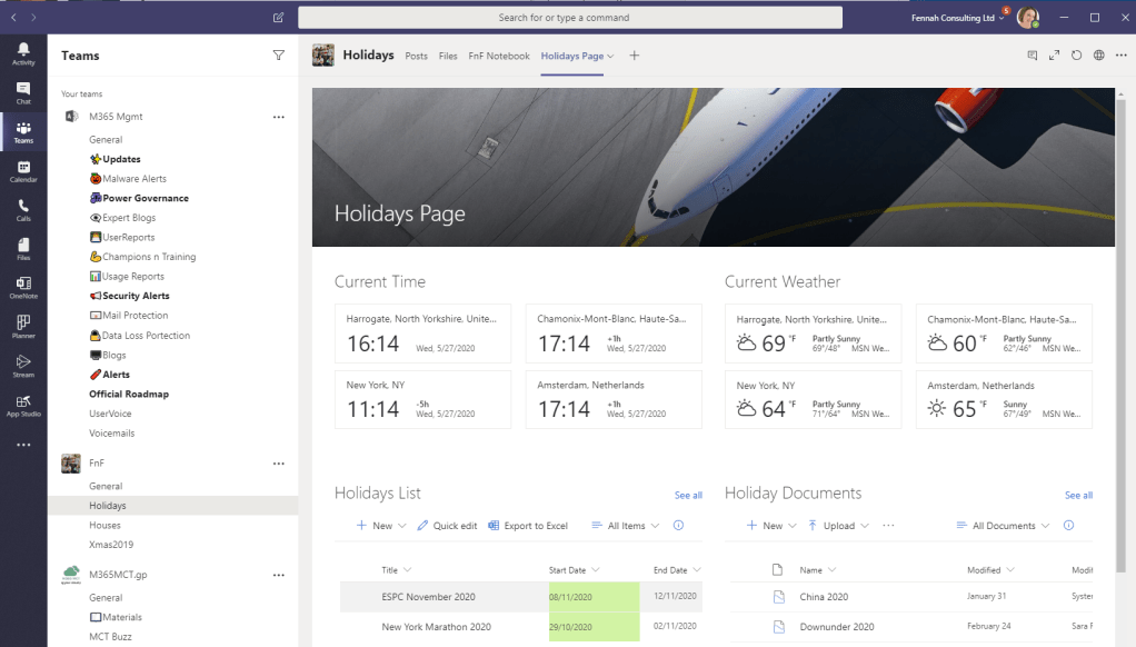 Though my personal favourite is to build a page which displays multiple SharePoint apps and web part together to give even more value and add that page to Teams. Like the page below which uses the World Clock and Weather web parts together with list and library for (hopefully) upcoming trips. (Oh and I’m not the runner in the family!)