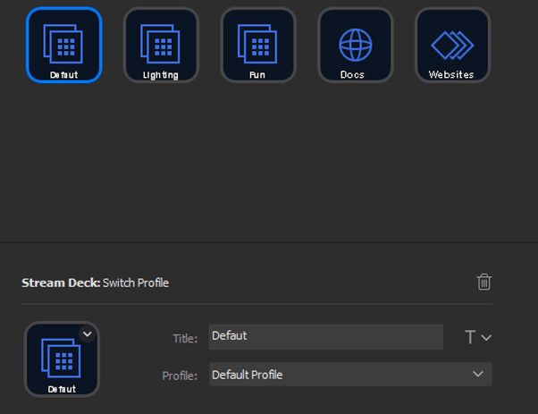 With all these different scenes my Stream Deck set up was running out of buttons! But you can add a button that switches profiles, so I separated my scenes by category and added a profile for each. There then just remained the need to create buttons to switch between profiles.