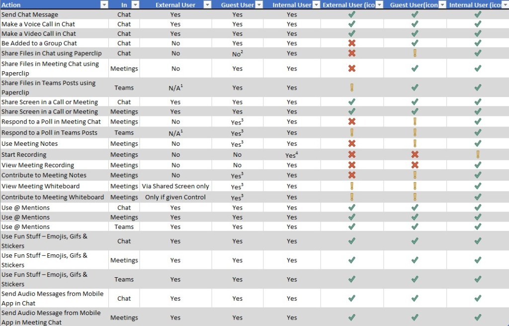 I started out with https://docs.microsoft.com/en-us/microsoftteams/communicate-with-users-from-other-organizations which compares the features external users and guest users can use in Chat. The table above is based on my testing of these features. However I’ve included the original here as it stood when I wrote this article and I’ve expanded the footnotes to the table from that article here.