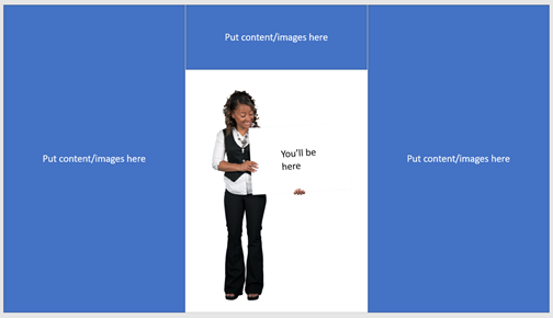 - Remember Teams will sit you in the middle at the bottom of the screen so keep key details away from the middle third of the screen, though you can use the top section – use the areas shown in blue below and avoid the white bit where the person is