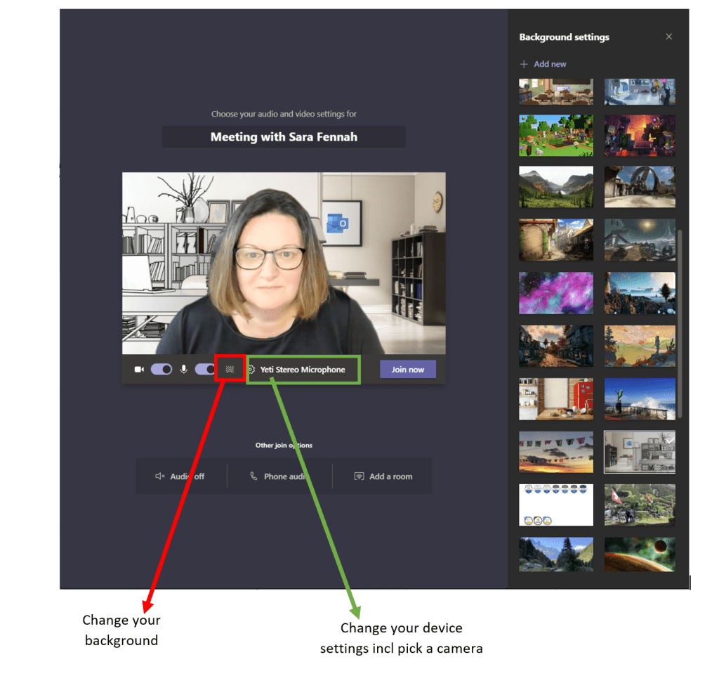 As backgrounds are persistent between meetings, use the Meet Now button to bring up your meeting join screen.