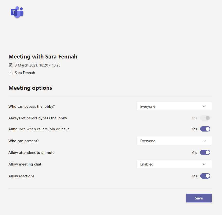 The lobby settings allow you to protect your meeting from uninvited guests. The Invited Users setting is probably the best in most scenarios, however at the time of writing this option is rolling out and not available to everyone yet, so the second best is people in my organisation or Just Me. After all you don’t want any ‘Zoom bombers’ invading your Teams meeting.