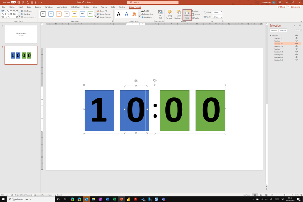 Assuming you are counting down minutes & seconds you will need to display 4 digits on the slide, each digit will need to be in its own text box. In this worked example I am going to assume a 10 minute timer.