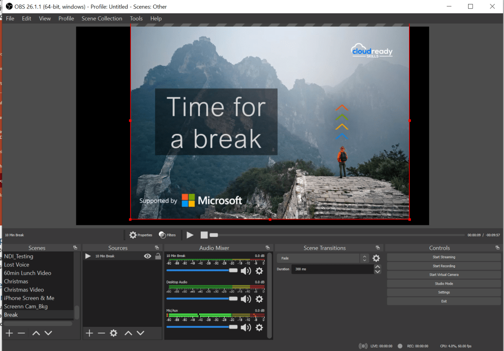 You may also wish to add a placeholder – let’s start again slide at the end to give you time to switch over to the normal input at the end so as to avoid ending on a black screen. However if you are using OBS Studio, you can add a static image to the scene instead.