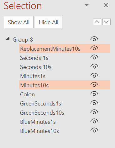 Next we’ll add the digits to change the minutes. Starting at 10:00, we should next see 09:59. to do this duplicate the first minutes digit and change to 0. Edit the name of the text box in the selection pane. Select both the starting digit and its replacement in the selection pane and use the alignment tools to align the two text boxes by center and middle so they are completely aligned.