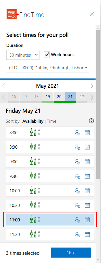 Choose the times you want to offer. Note internal people show as green person icon if they are availalbe and red if they are not, whilst external people will show as grey person icon as you cannot see their availability.