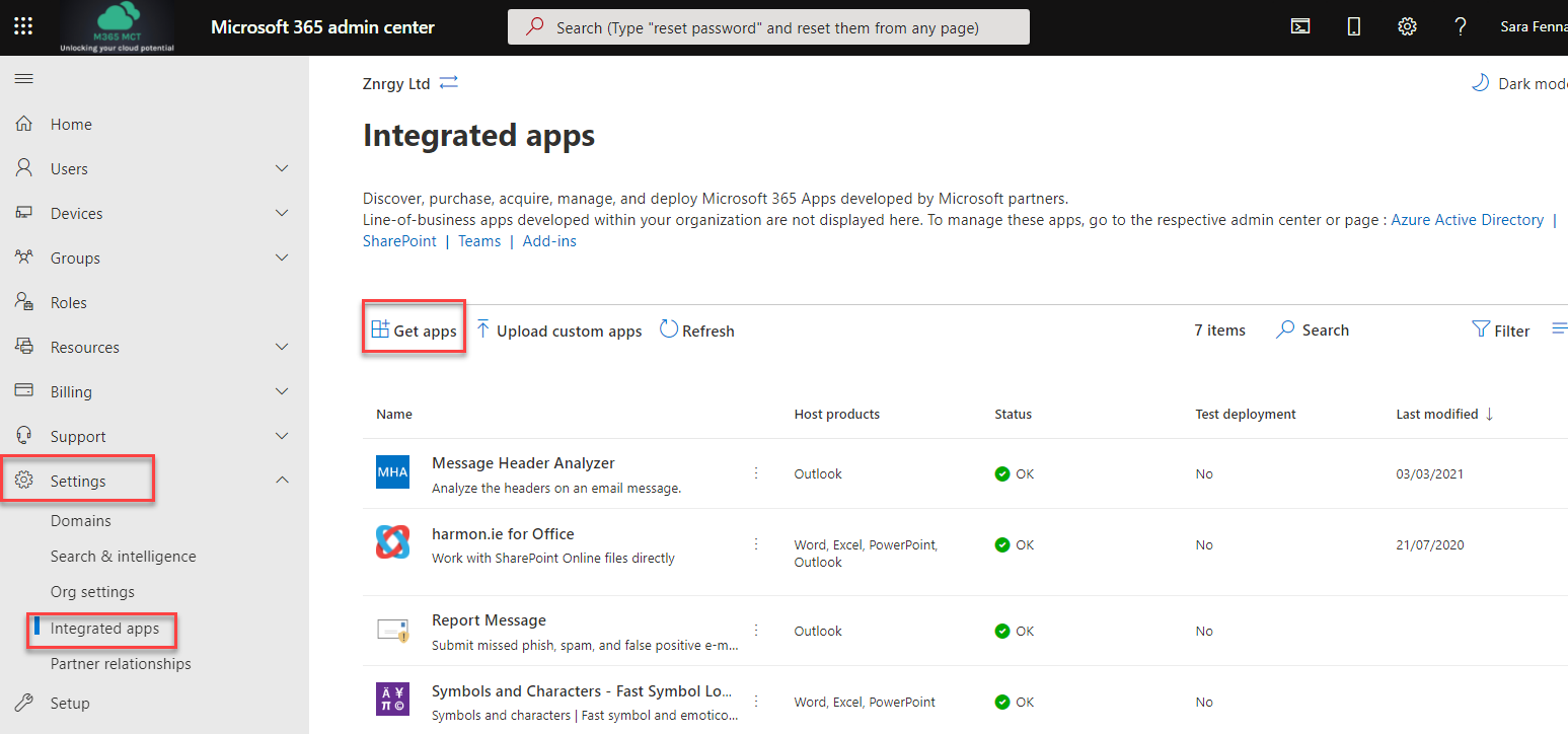 In the Microsoft 365 Admin Center under Settings choose Integrated apps then click Get apps