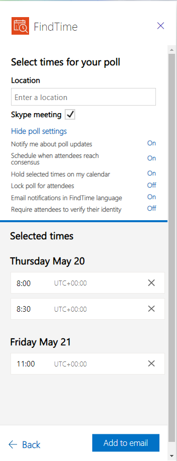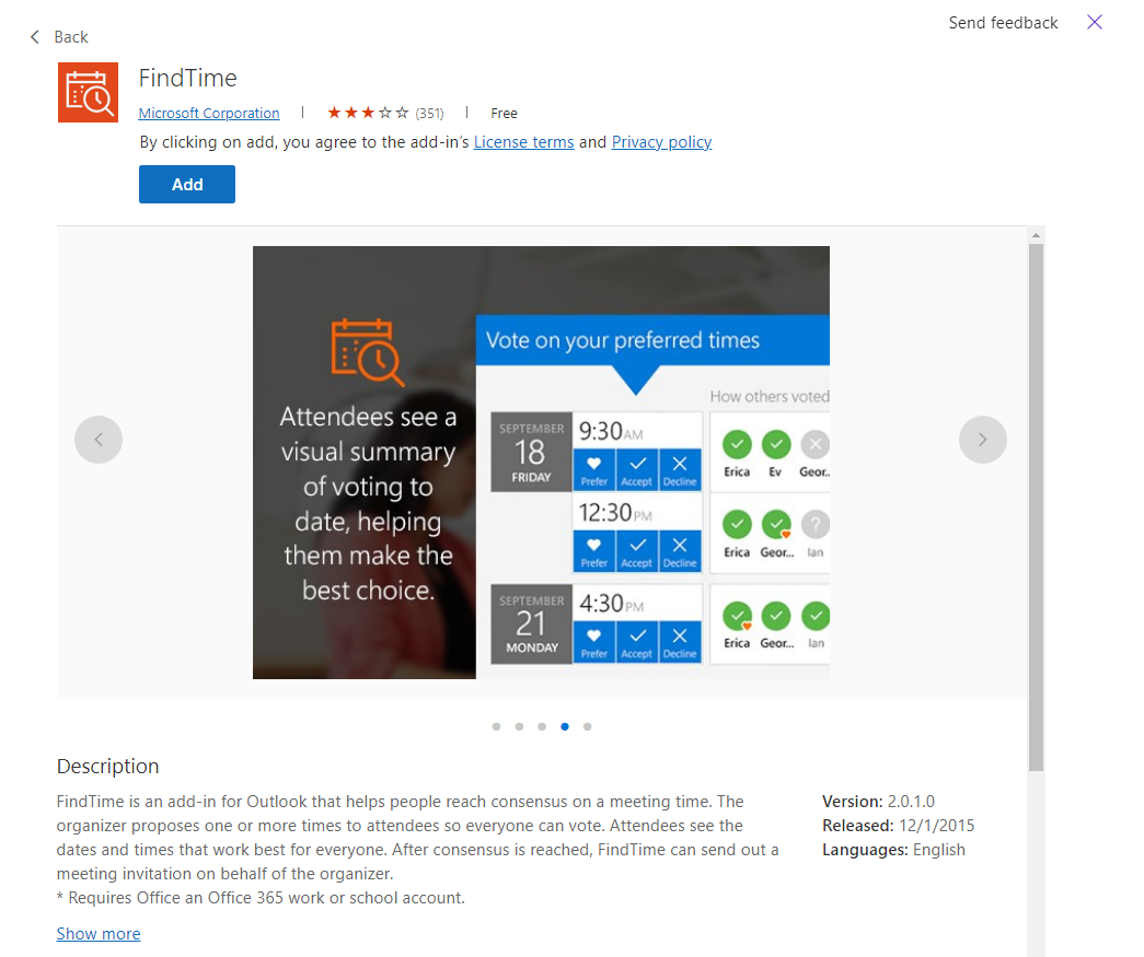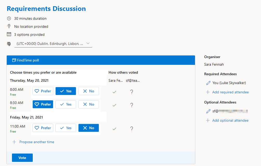 Find Time is a great add-in for Outlook which you can use to arrange meetings with both colleagues and people outside your organisation. Combining the ability to see availability for colleagues with a poll for people to vote on, the Find Time add-in is designed to stop the to/fro of emails trying to find a suitable meeting time.