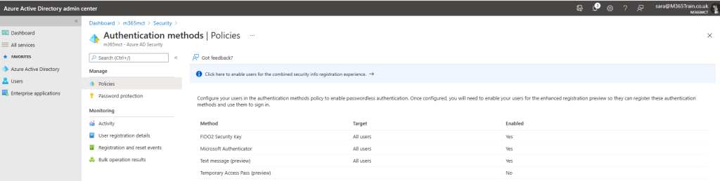 Once you are done, get a test user to sign in to the browser or use the https://aka.ms/MFASetup in order to configure mutli factor authentication for themselves, which can include the security key