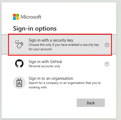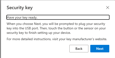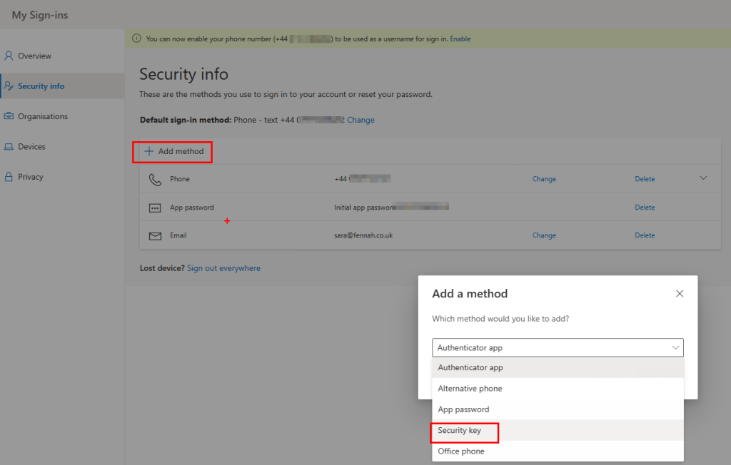 On to Microsoft 365. You need to navigate to your Security Info page at https://mysignins.microsoft.com/security-info and choose Add method then pick Security key and click Add. At this point you may be prompted to sign in to your account again using MFA and will have to repeat this step once you are signed in.