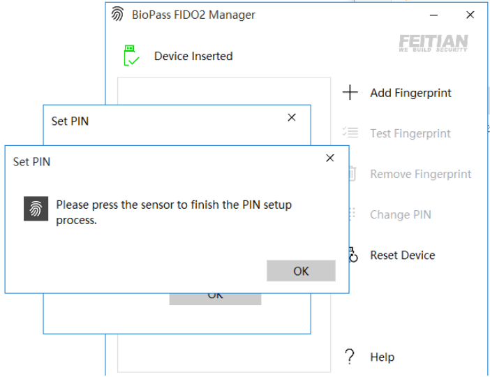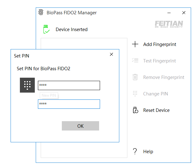 With the app installed, connect the key via a USB cable and click the Add Fingerprint to add the first fingerprint you wish to use. Create the device pin at the prompt. The Pin allows you to manage your key from a PC and easily change PCs and still manage/use the key.