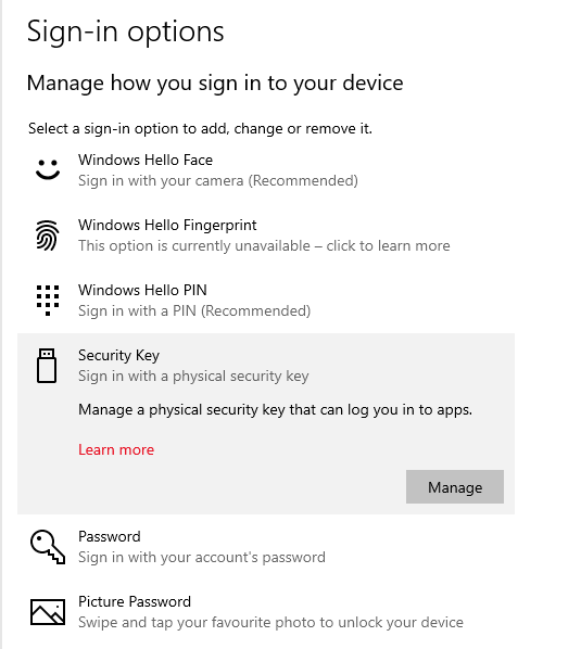 Next we’ll add the device so the PC know it can use it for sign in to apps. In Windows Settings, navigate to Account then Sign in Options and expand the Security Key section, click Manage then authenticate on your key.