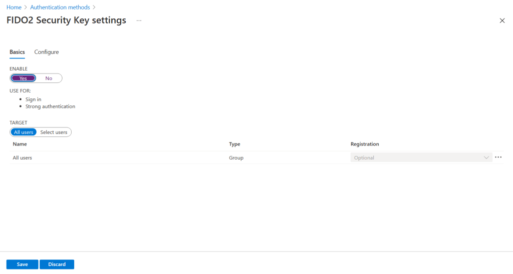 Change enable setting to Yes and either All Users or select users and choose users or groups who can use a security key, then click Save