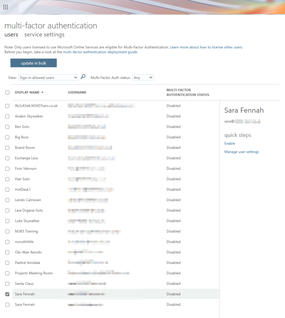 If your Microsoft 365 tenant does NOT yet have MFA enabled. Once you have allowed the required methods (you need at least two) navigate to the Active Users page in the Microsoft 365 Admin Center and choose Multi-factor authentication