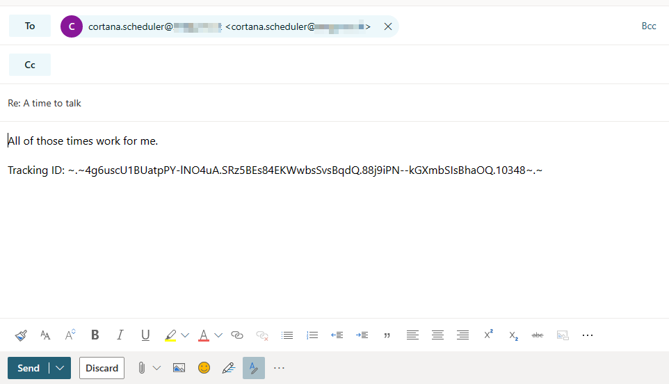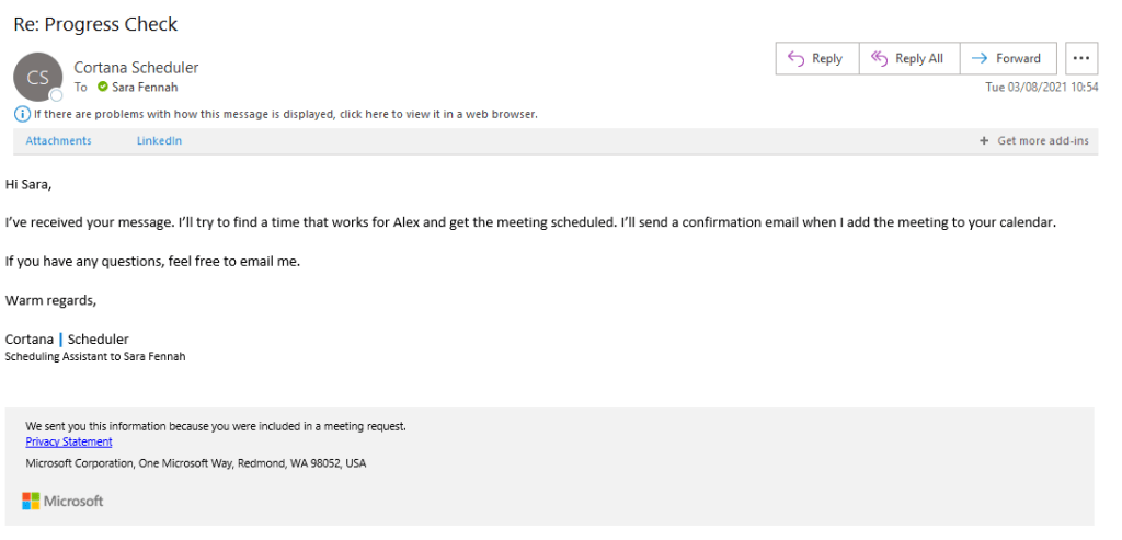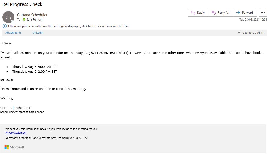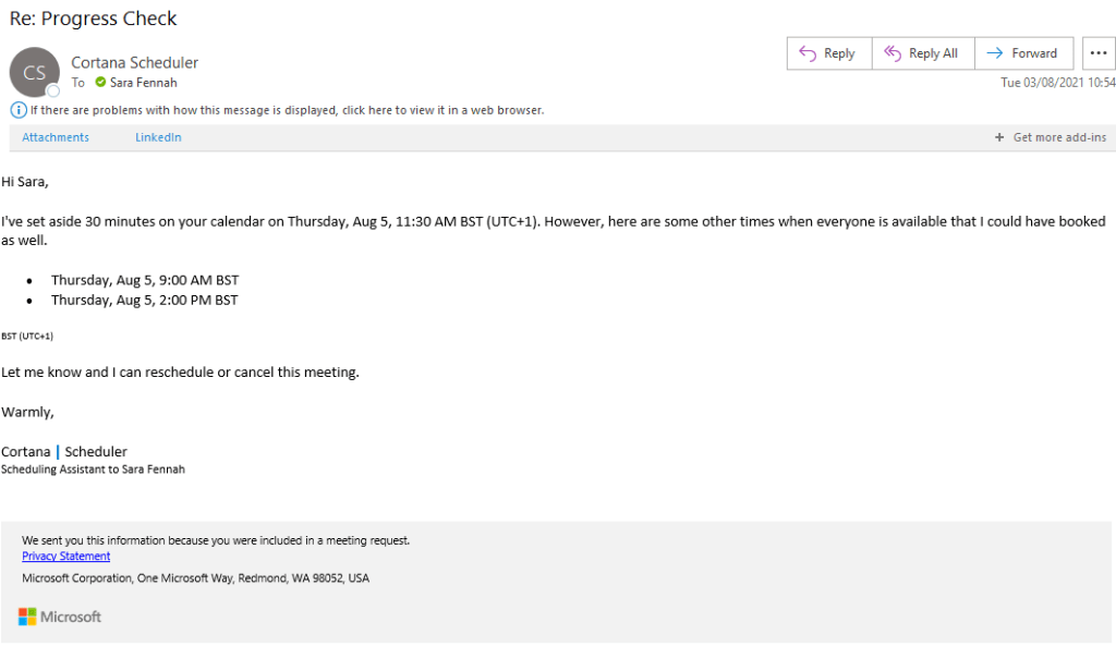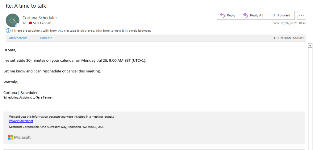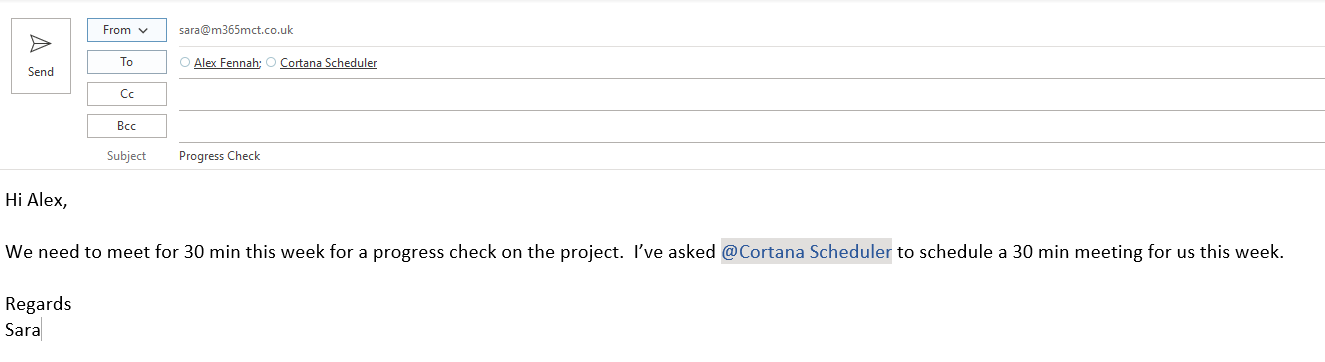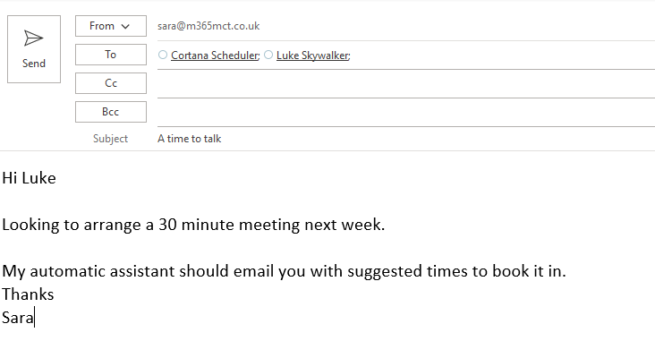 To arrange a meeting with an internal colleague, send a message to the colleague and the Scheduler mailbox (which we have called Cortana Scheduler). Be sure to include the instruction to schedule a meeting , how long the meeting should be for and within what timeframe the meeting should take place.