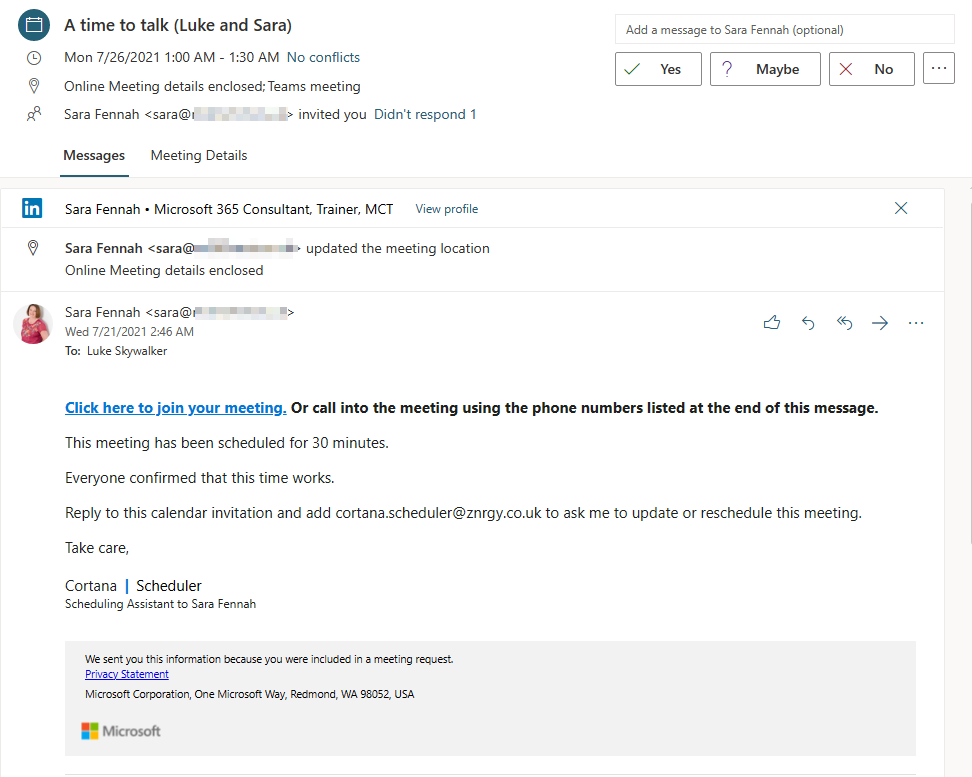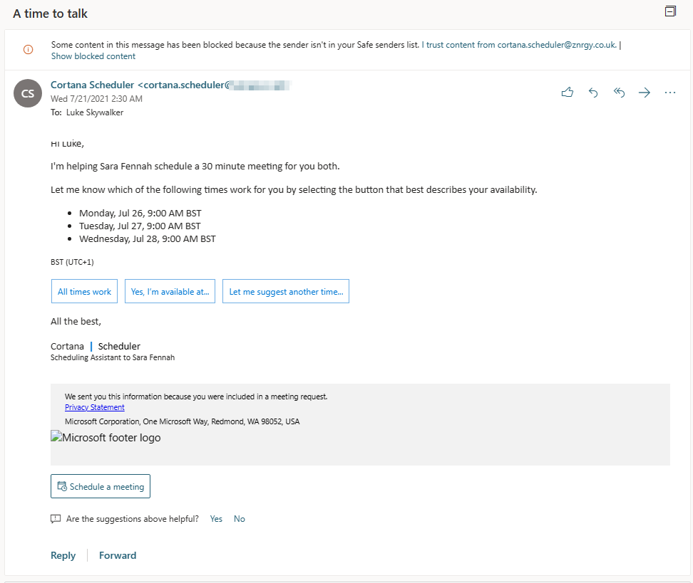 For such a seemingly simple service the licences seem quite expensive at $10 (£7.50) user/month (see Buy Scheduler for Microsoft 365) plus you need an Exchange Online licence for the Scheduler mailbox, however when you consider that many of us now have complex diaries and no assistant to handle the diary for us, this tool could end up saving you a lot of time. It’s also worth considering that the meeting scheduled by Cortana Scheduler sets the original email sender as the meeting organiser and this could be very helpful in avoiding issues with delegated meeting creation (see my blog on delegated meetings)