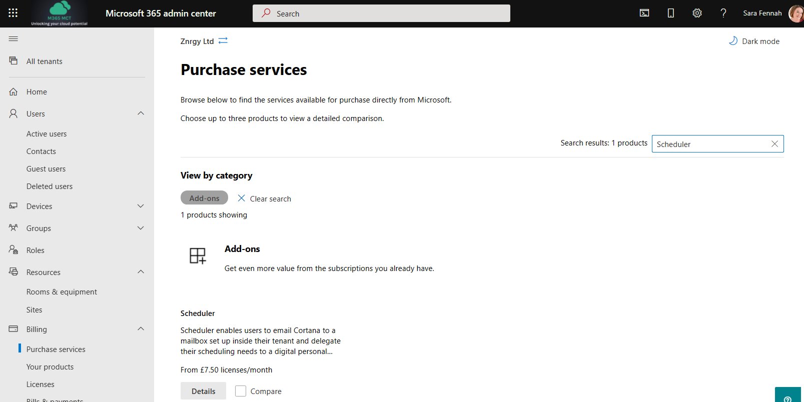 You will need a Scheduler licence for each person who want to organise meetings using the service. Meeting invitees do NOT need a Scheduler licence. Licences can be added via purchase services from the Microsoft 365 Admin Center under Billing or by contacting your Microsoft Partner. Note: Scheduler can be added to most Office 365 licences which include Exchange Online but not all but is only available in English. Check licencing guidance before purchasing the addon