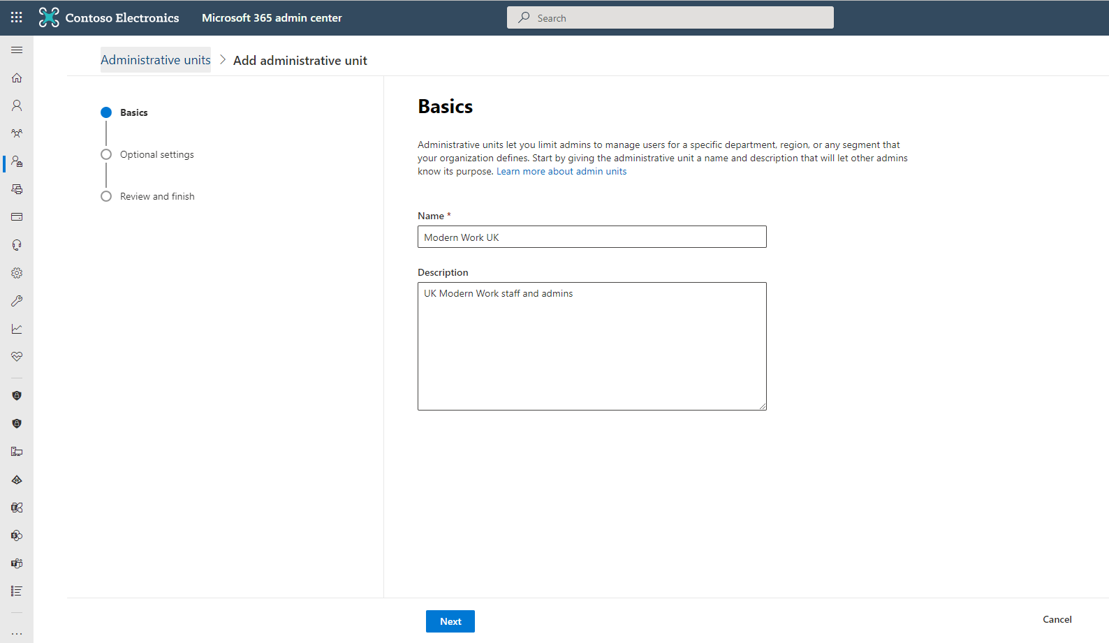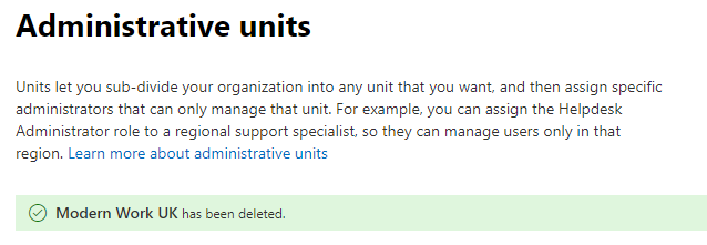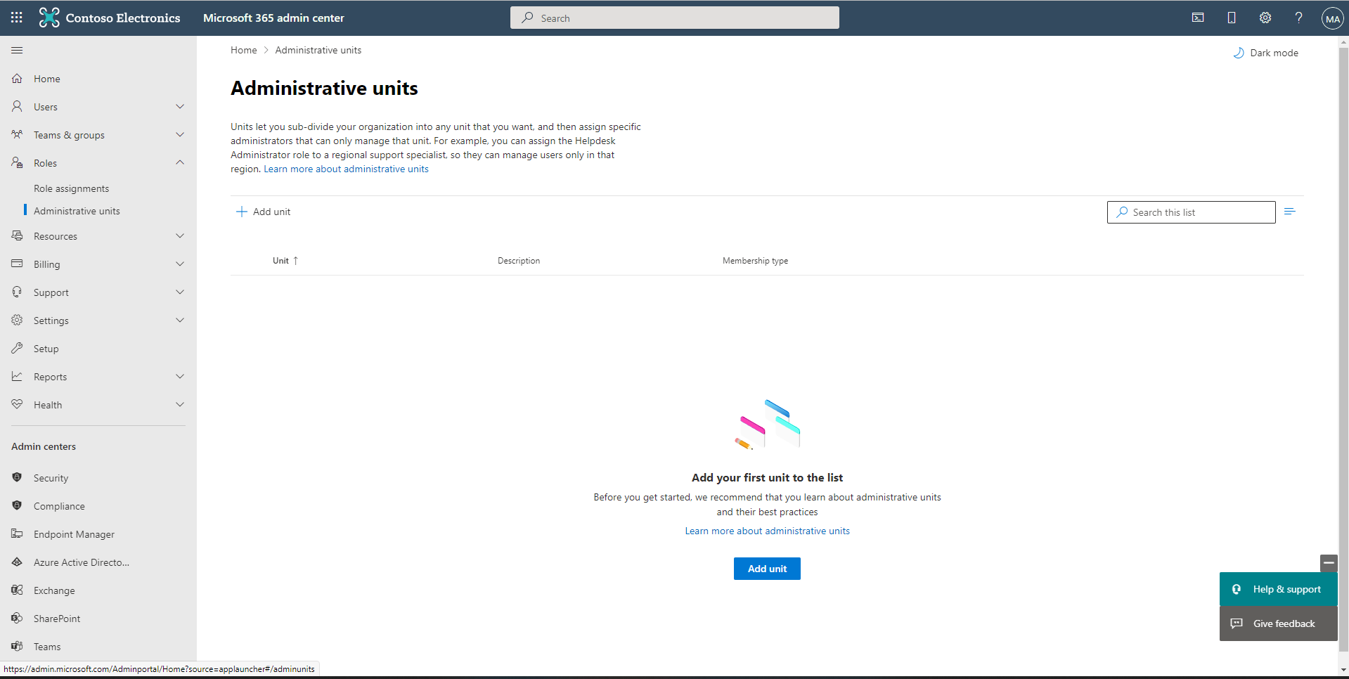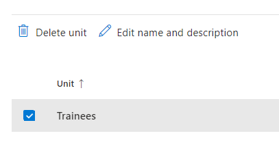 In https://admin.microsoft.com/ under Roles and Administrative units, locate the unit in the list and select.