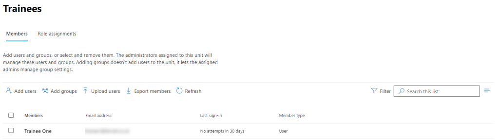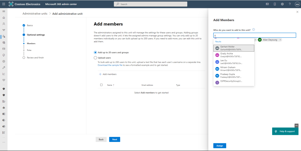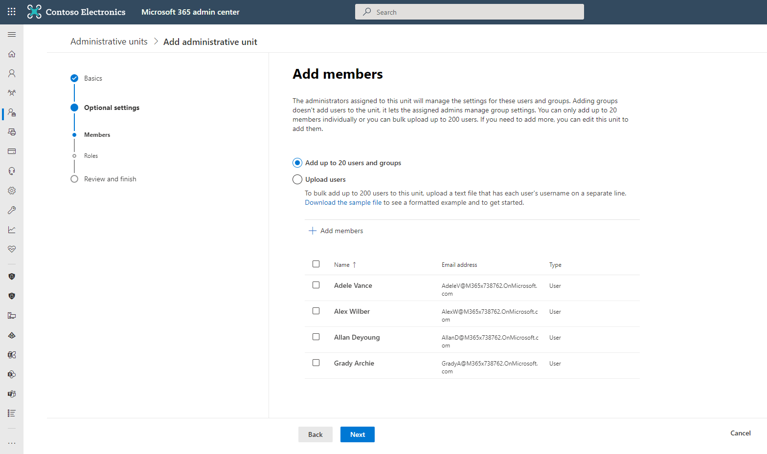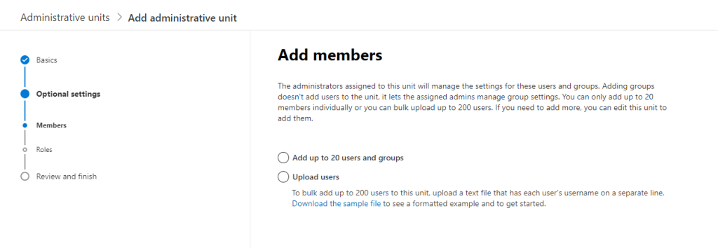 You now need to add the members of the unit. You can add 20 individual users or 20 groups, alternatively you can create a text file with up to 200 users and upload that. Do NOT include the users who will be assigned Admin roles for this group.