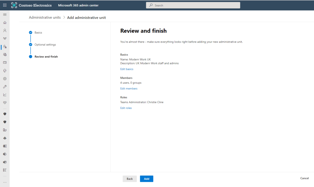Once you have added all the required admins, click Next and review the setting before clicking Add