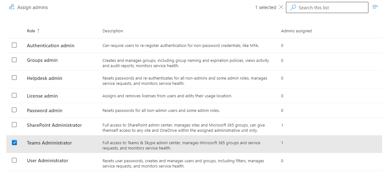 Now you can choose the roles you want to specify admins. Pick the role and click the Assign admins button to open the assignment blade. You can also click on to the role name and the click the Assigned link in the blade to enter the assign admins screen.