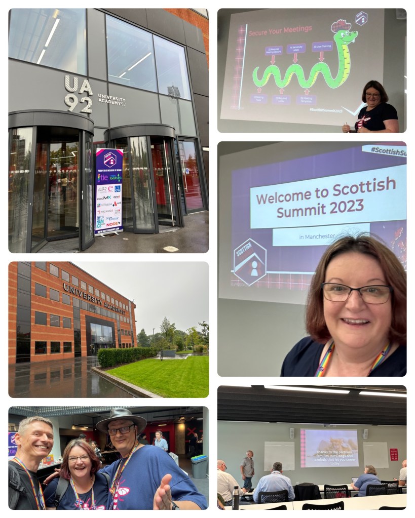 Collage showing (from top left going clockwise) the UA92 Entry, me presenting my session (photo credit to Thomas Stensitzki), selfie with the Welcome to Scottish Summit slide, Kevin McDonnell and his “thanks to the partners, families, cats, dogs and axolotls that let you come today” slide, with Vesa Nopanen and Michal Ziemba (photo credit Michal Ziemba), UA92 in the rain.