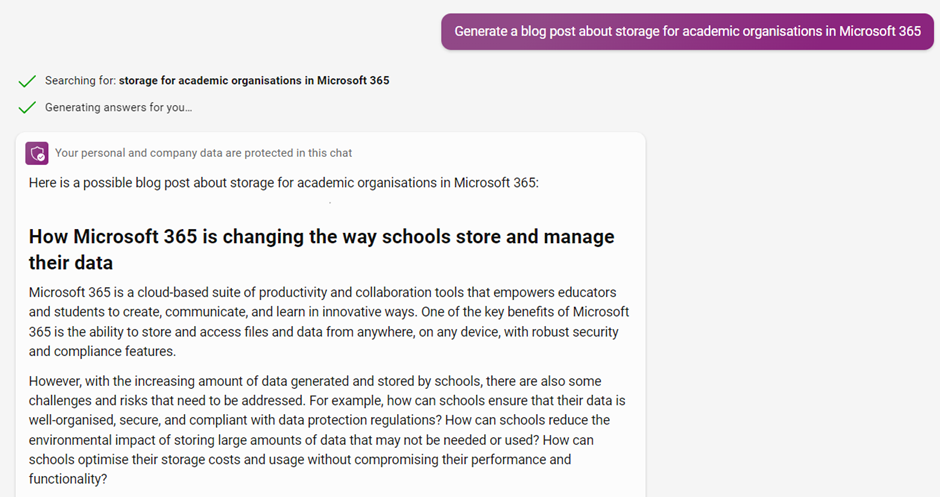 I fully expected to need to refine my request, but I was surprised at how well the prompt worked. The images below give a snippet of the results and the full text of the answers are included at the end of this article. The most interesting thing about the results for me, was the different approach. Whilst Typeface AI went for a factual definition of storage in Microsoft 365, Bing Chat Enterprise results are obviously heavily influenced by current news and trends in searches on the topic.