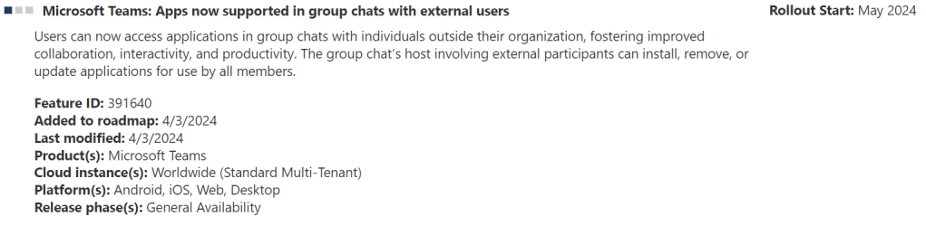 2nd, another new addition to the roadmap. Apps in group chats which include external users is an interesting one. This update is also due to start rolling out in May 2024.