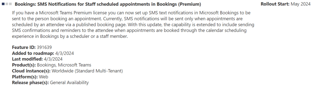 Added to the roadmap, users with Teams Premium will be able to set up SMS notifications for booking made through Microsoft Bookings.