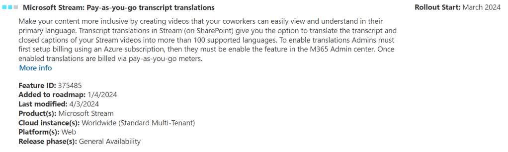 Translated transcription capabilities via a pay-as-go feature is now rolling out in Microsoft Stream. More information from https://support.microsoft.com/en-us/office/microsoft-syntex-pay-as-you-go-transcript-translations-in-stream-for-sharepoint-2e34ad1b-e213-47ed-a806-5cc0d88751de