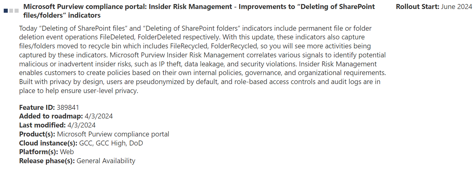 Added to the roadmap on April 3rd is an update to Insidier Risk Management in Microsoft Purview which will be rolling out from June 2024. Improvements to the risk indicator of deleted files & folders, which will now include files moved to recycle bin as well as files deleted.