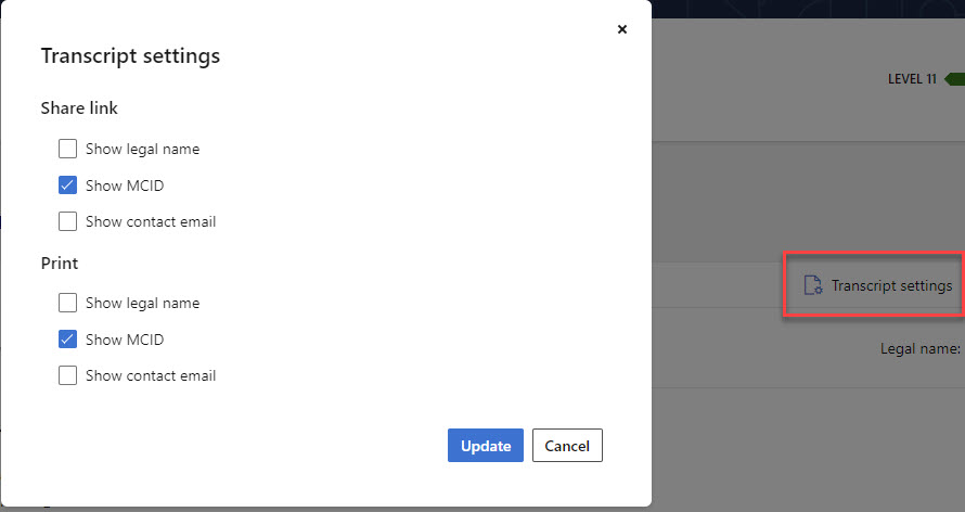 To remove your email and/or legal name, select Transcript Settings and change the settings to suit.